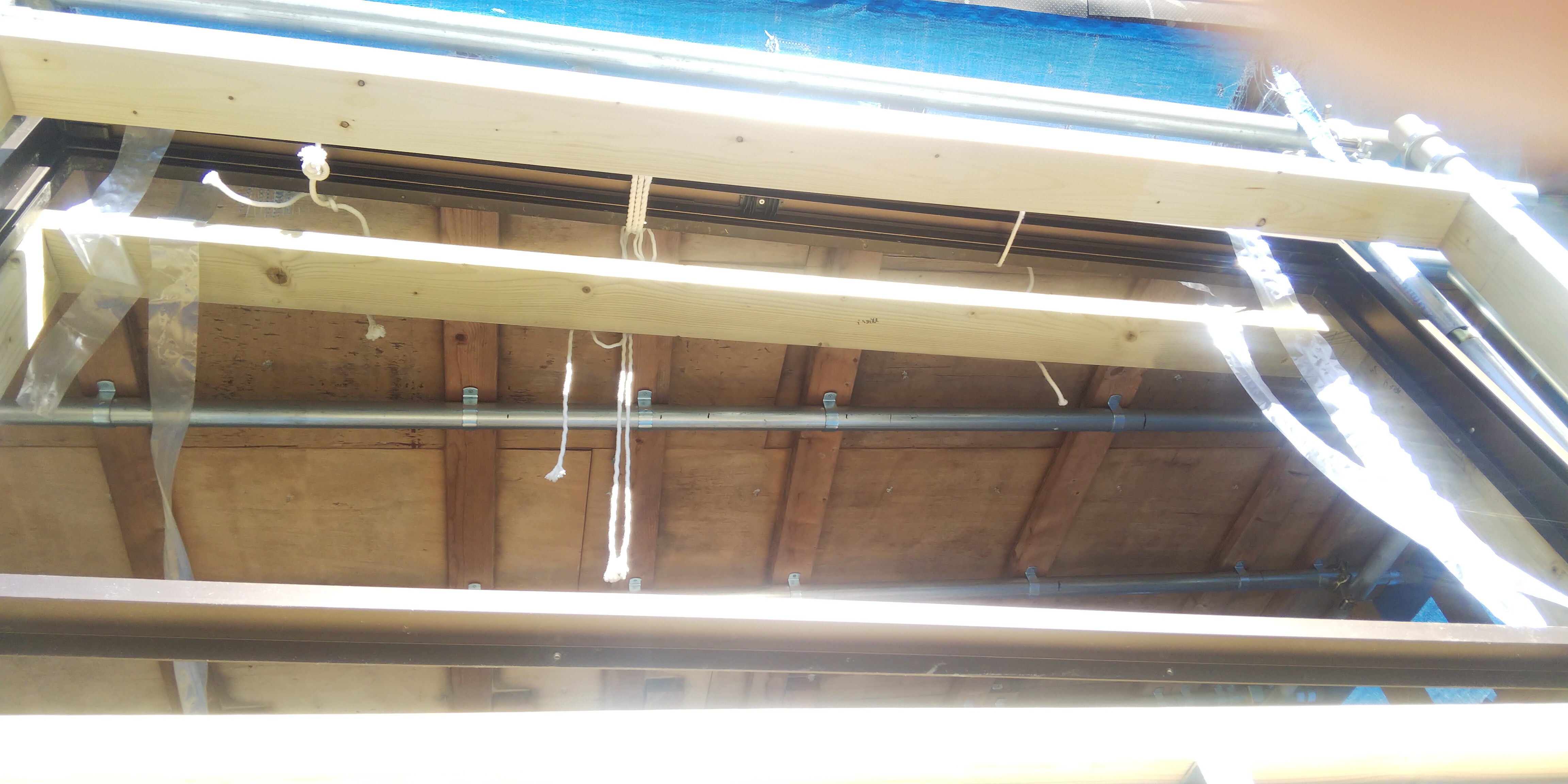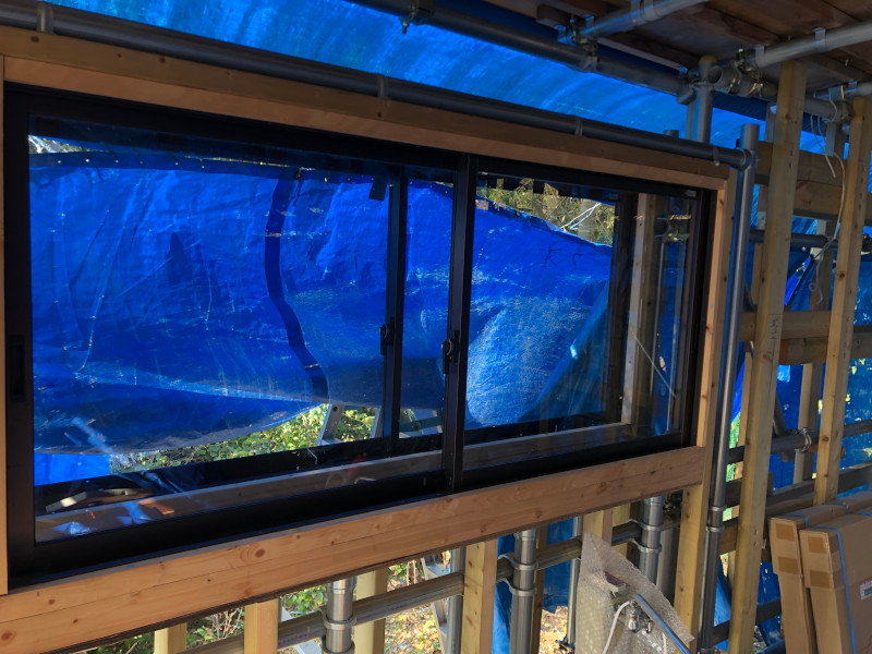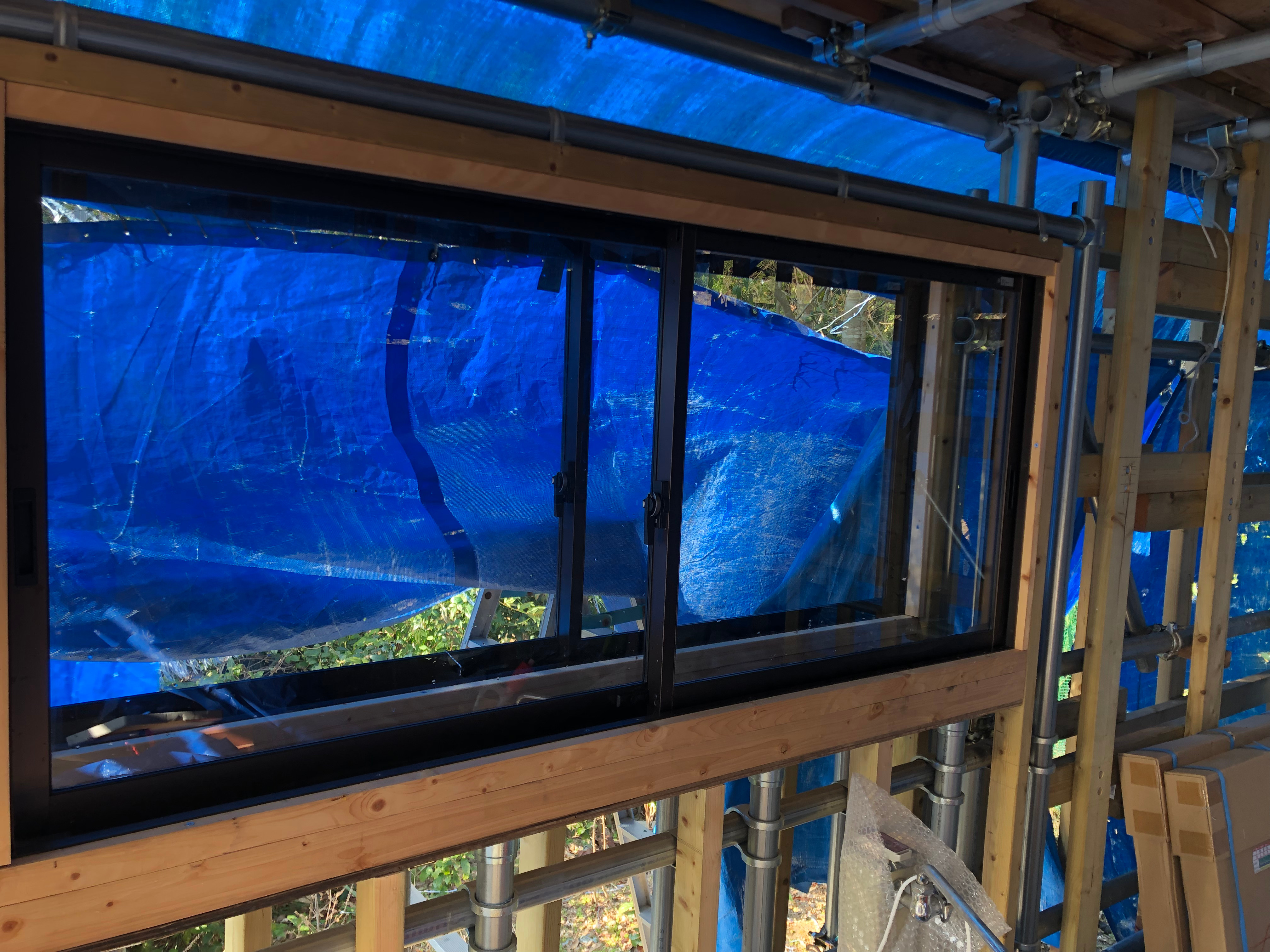 窓枠を組み立てたが、単管パイプと木枠に邪魔されて設置できなかった。写真のように宙吊りにしたまま組み立て、無事設置。